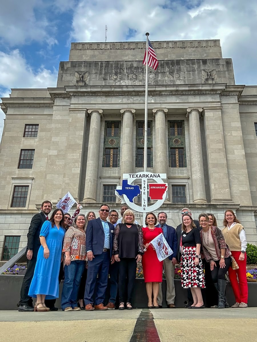 That evening, the caravanners couldn’t resist a quick visit to “photographer’s island” on their way to a reception with area city officials, school leaders, alumni and staff from various outreach programs for a reception. One of Texarkana’s unique features is having the only U.S. Post Office sitting in two separate states. The team snapped photos outside the working post office and federal courthouse while officially standing in Arkansas and Texas.